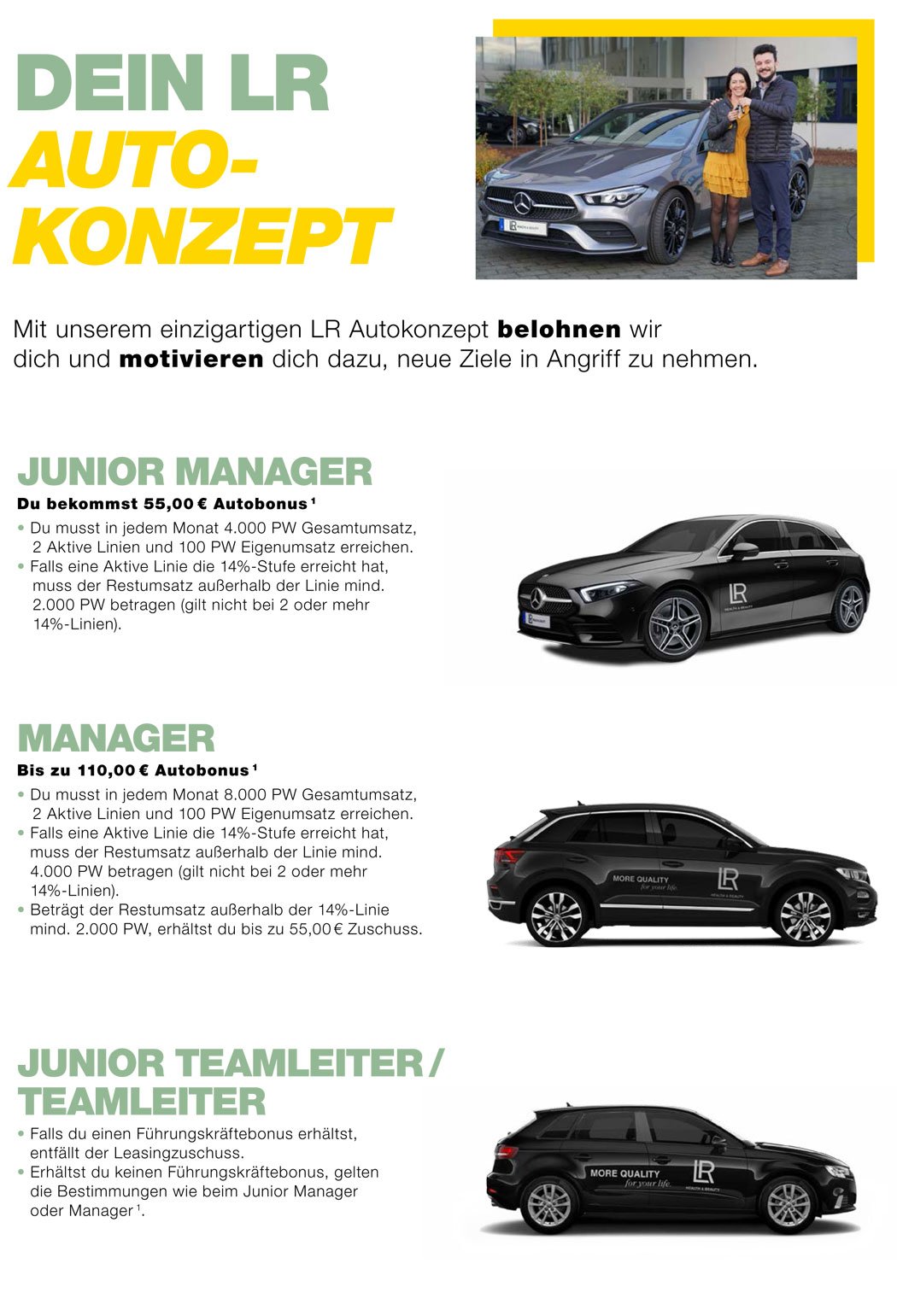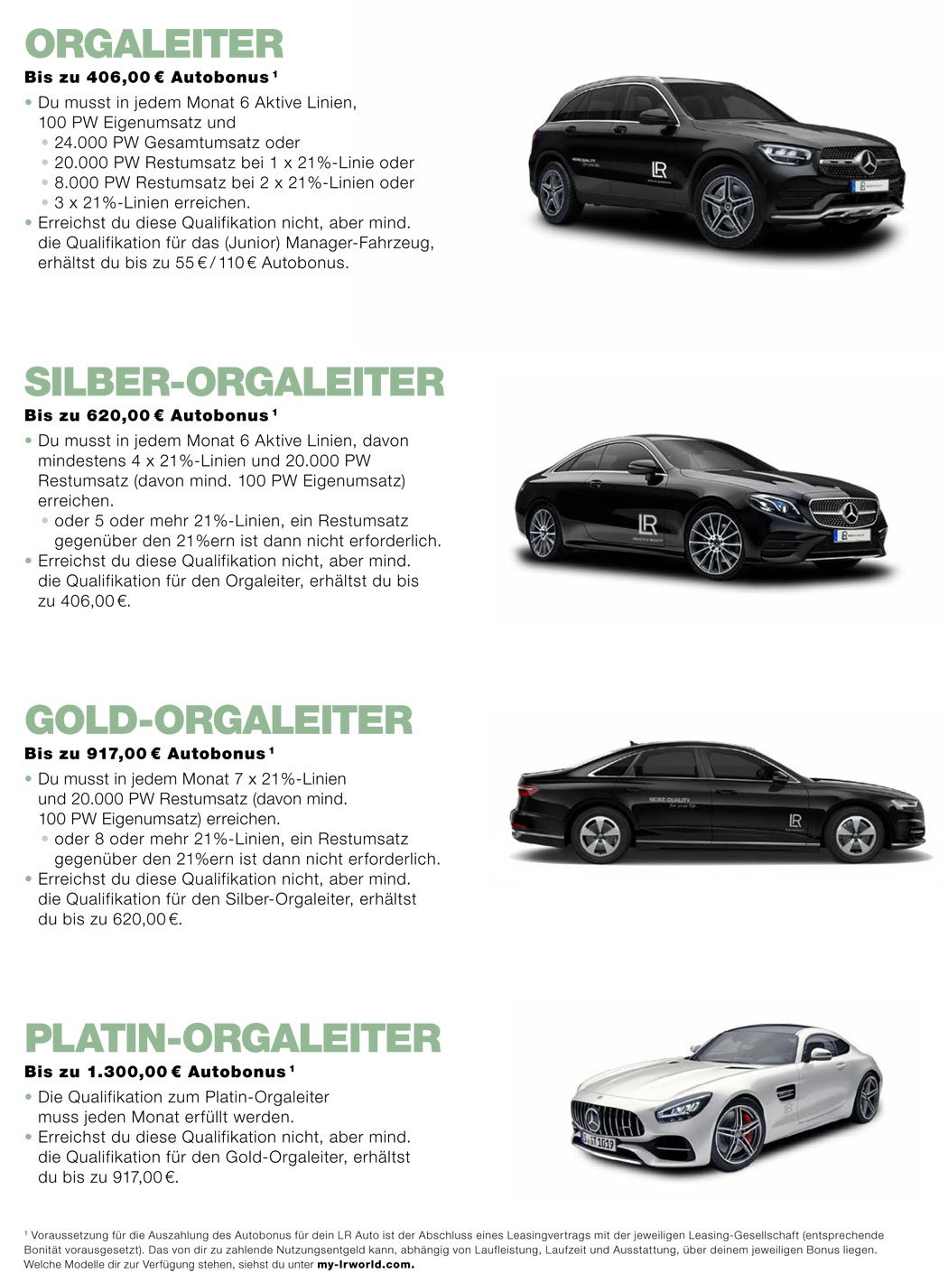 Abhängig von deiner Qualifikation erwarten dich bei LR verschiedene Mercedes-, BMW-, VW-, Audi- oder auch Porsche-Fahrzeuge zu stark vergünstigten Leasingraten. Zusätzlich unterstützen wir dich mit unserem Autobonus in angepasster Höhe je nach Erreichen der monatlichen Qualifikationskriterien.